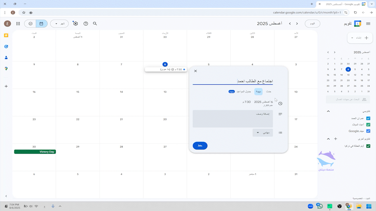 إدارة Google Calendar، إضافة مهام، إرسال دعوات للطلاب، وإنشاء رابط لحجز الاستشارات.